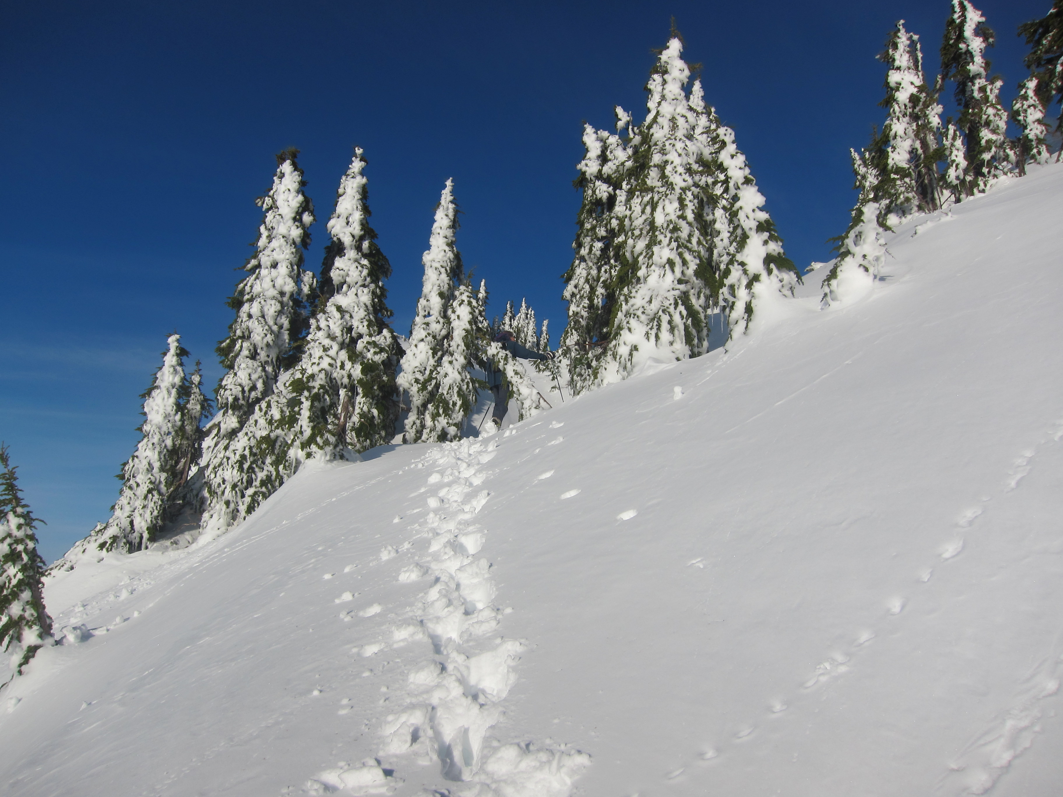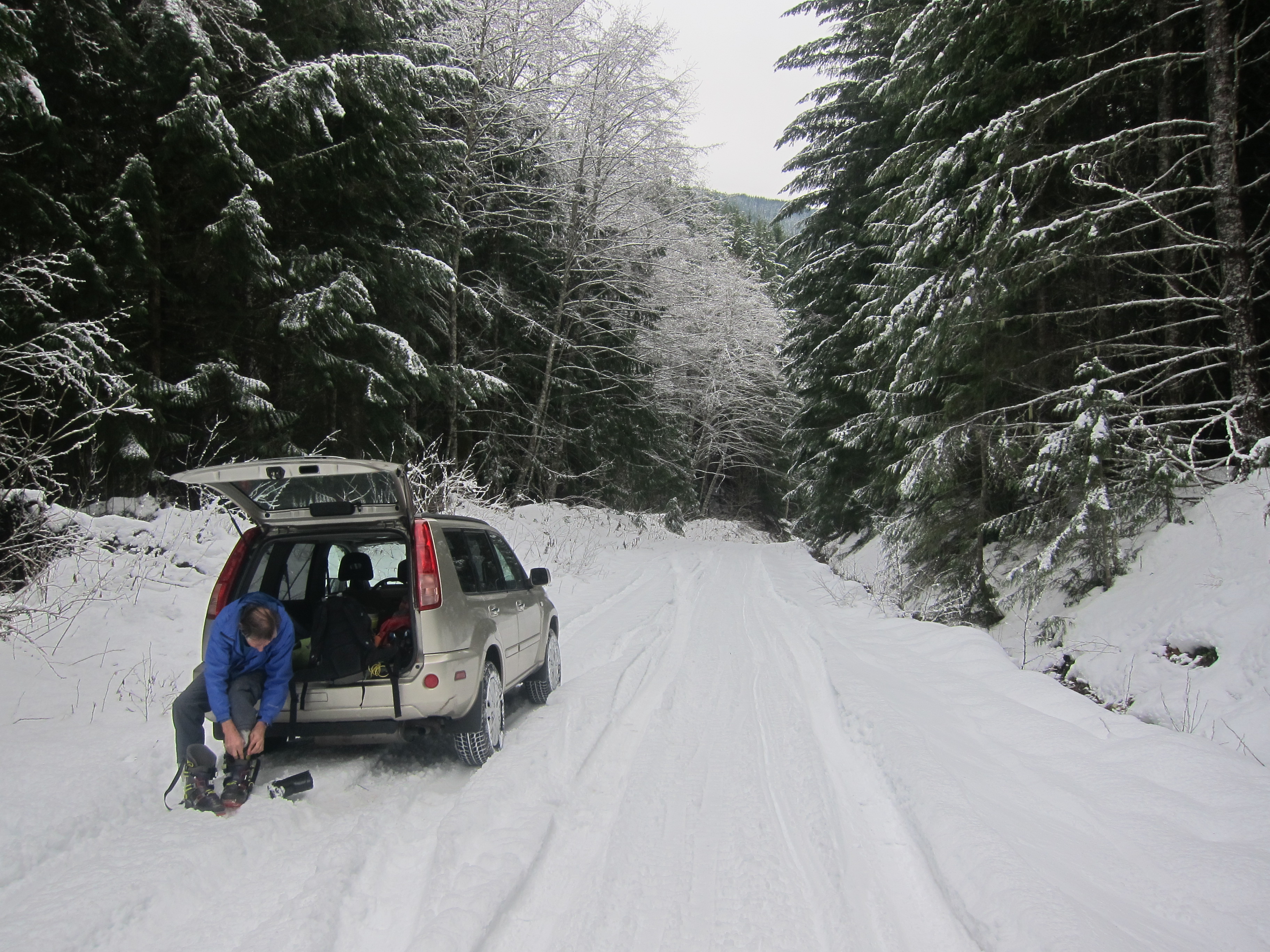 We summitted Alpen just before 2pm, and after stopping for 15 minutes for food and photos, made our way down. The first few hundred metres of skiing were good powder, but once on the logging road, what had been soft snowmobile tracks in the morning had frozen into icy ruts that made the run down the logging road both tiring and bothersome. Nonetheless, we made it back to the car just before 4pm, for a total round trip of 6 hours, with a bit over 1200m net elevation gain.