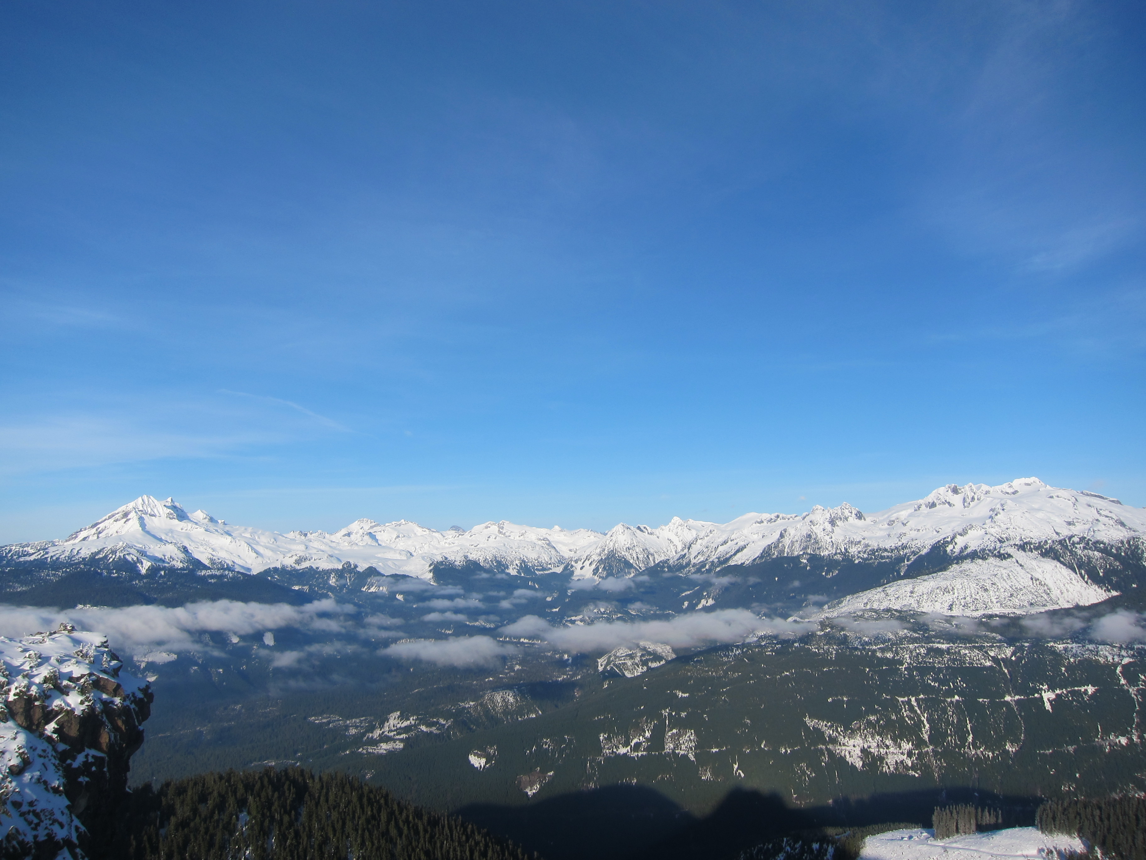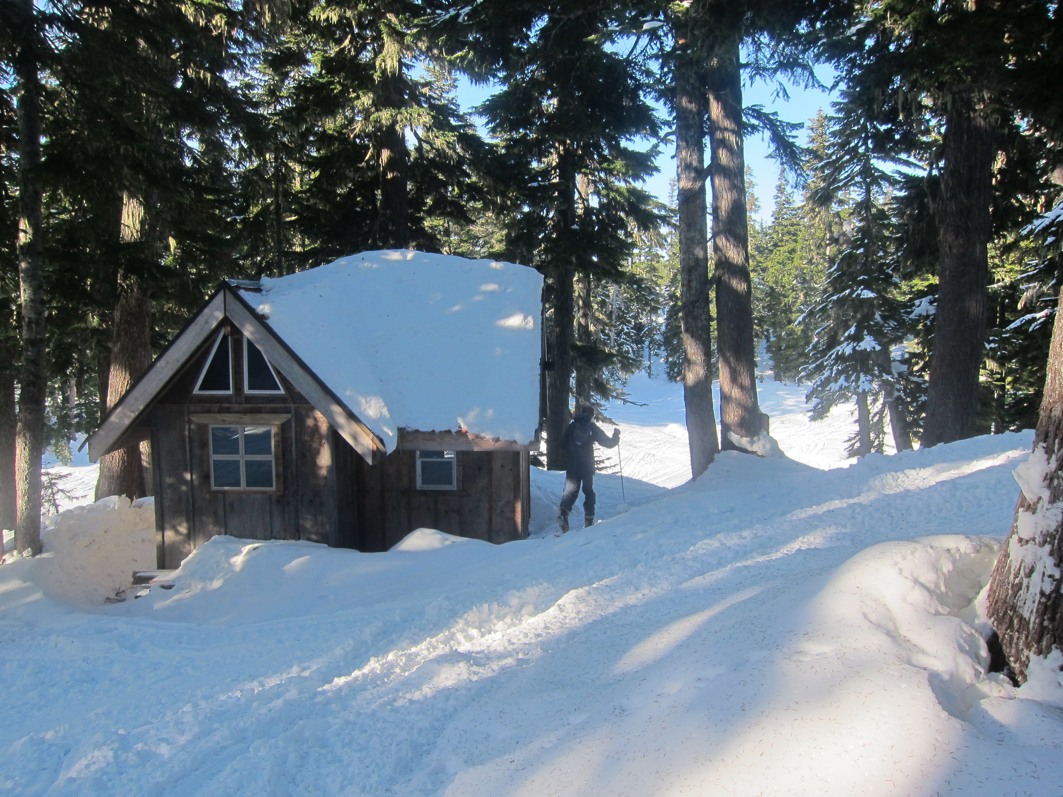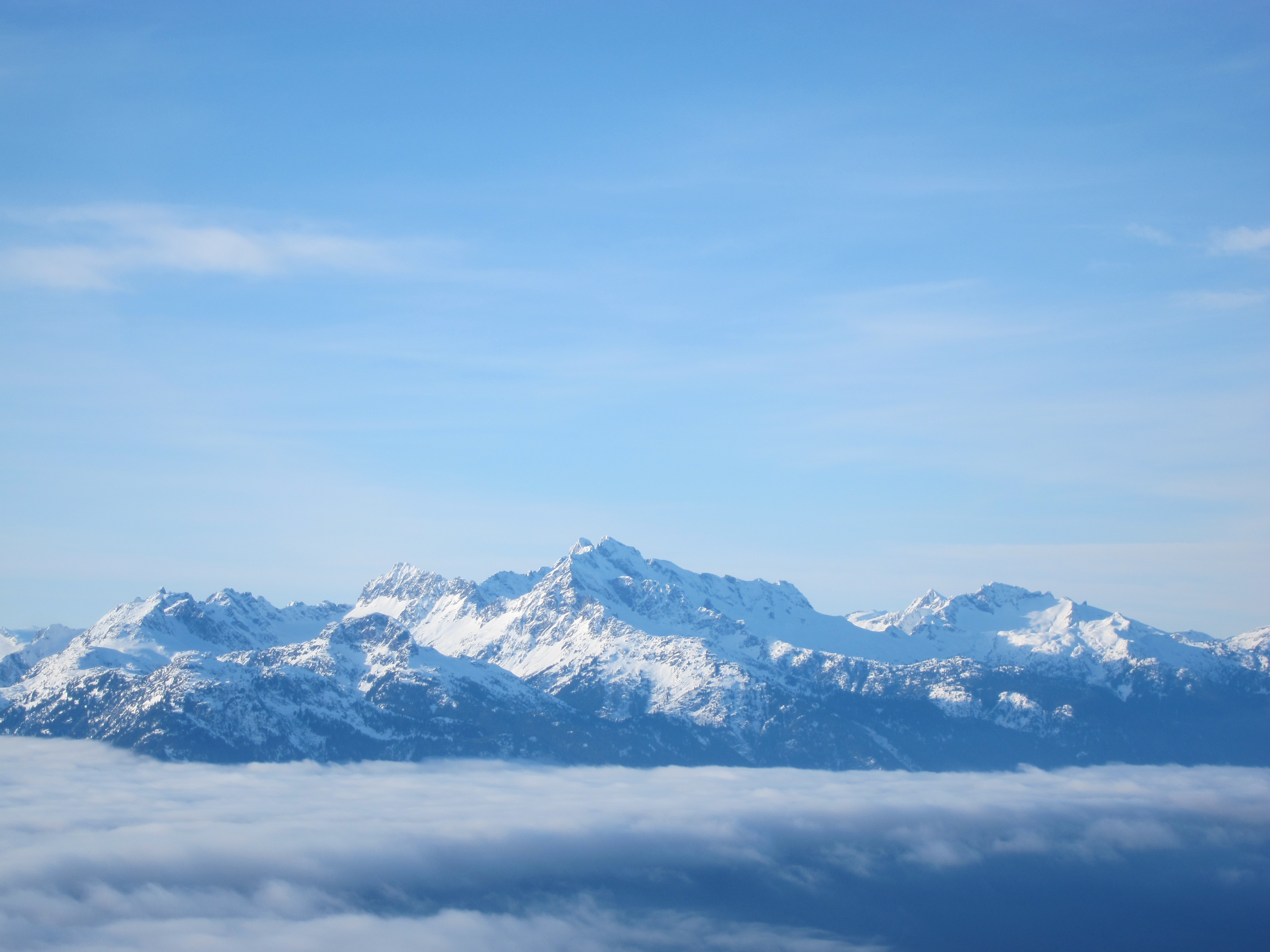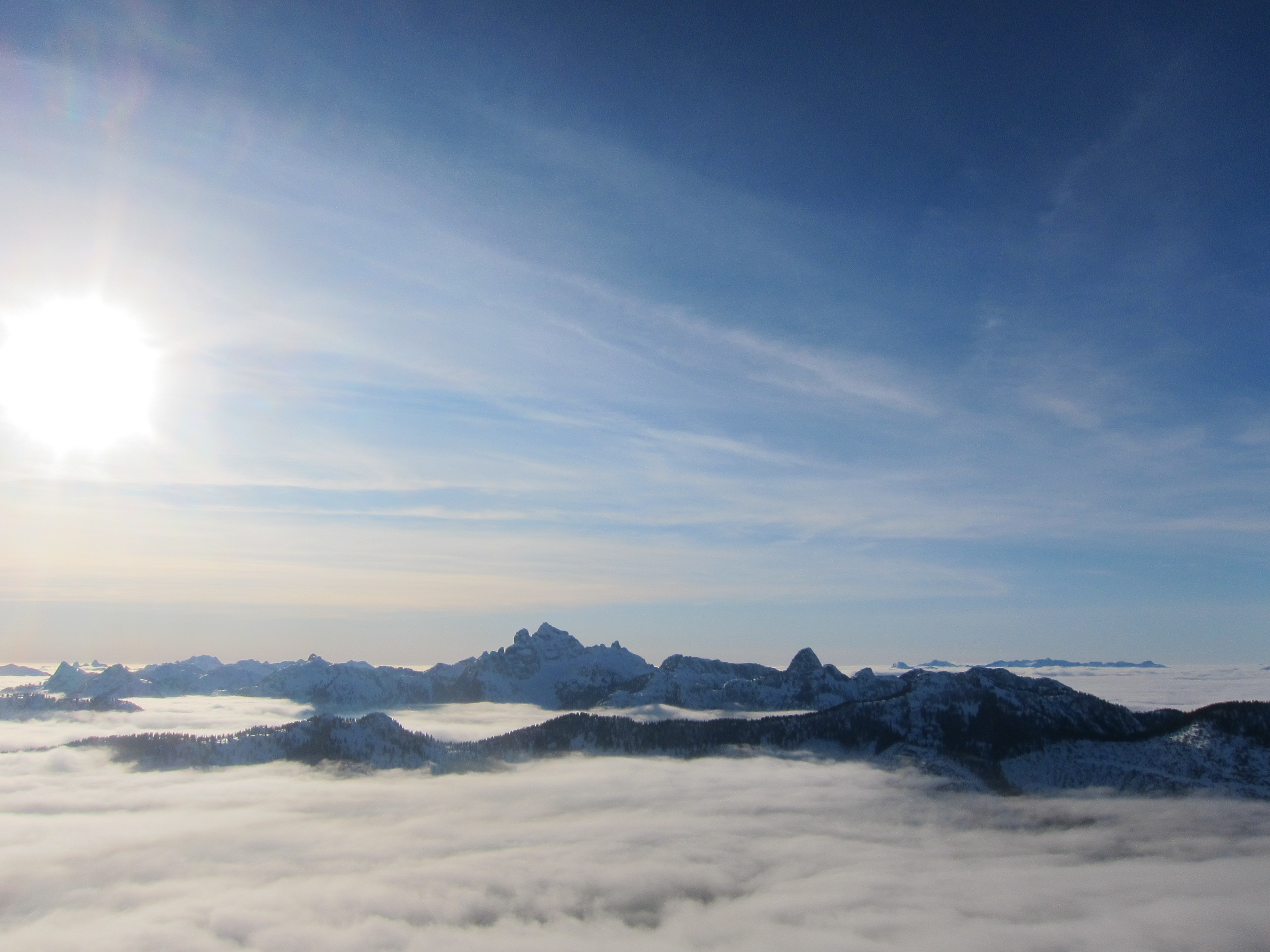 Leaving New Westminster a bit past 8, we drove up towards Squamish, headed onto the Mamquam FSR, and hit solid snow on the Alpen Mountain Spur (ungated at this time of year) at around 550m. After taking a bit of time to get the car turned around, and get our ski gear on, we were able to set out on skis right at 10 o’clock. Following some old snowmobile tracks, we gained the first ~800m of elevation on the main logging road (easy to follow, it’s the only non overgrown road in the area) under grey and foggy skies. However, around 1400m, not far below the old snowmobile hut at the end of the road, the skies suddenly cleared and we were presented with amazing views of Sky Pilot, Ledge, and Habrich to the west.