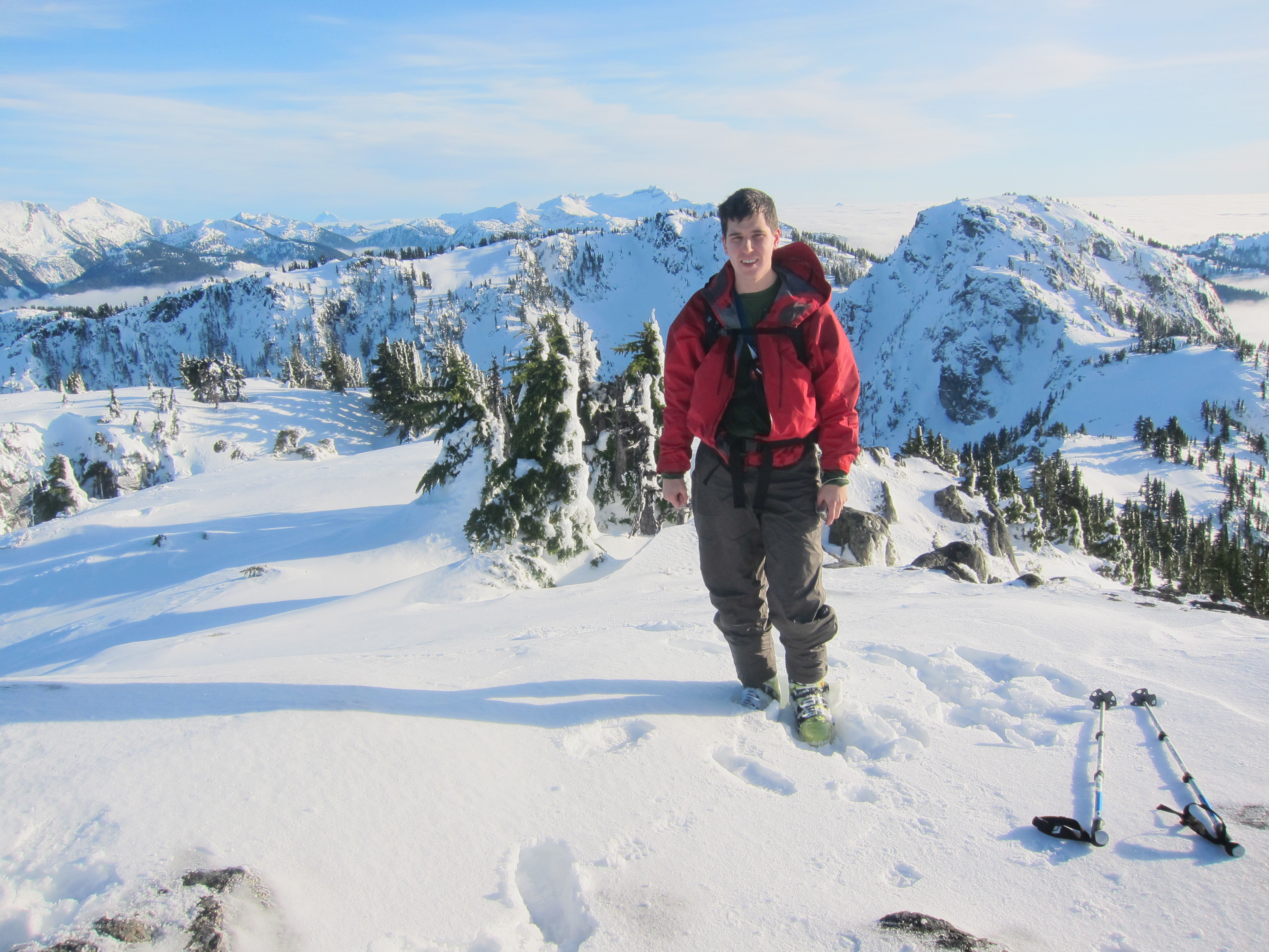 From the snowmobile hut, we followed what appeared to be ski tracks off to the north east, but soon realized that we were heading in the wrong direction to the peak, and had to contour back to the south, losing some elevation. Next time, the smarter route decision would be to turn right at the hut and head south, in order to directly hit the main basin below the summit of Alpen, where the west ridge can be easily obtained about 100m below the summit. Still early season, there was a mix of rock, ice, and snow on the ridge of Alpen, and so we left our skis behind about 100m below the summit and climbed straight up the west ridge, just above the north face. This route requires negotiating a few short, mildly exposed, steps of 45+ degree snow, and from the summit we learned that the smarter route would be to swing further around to the south of the summit before heading straight up.