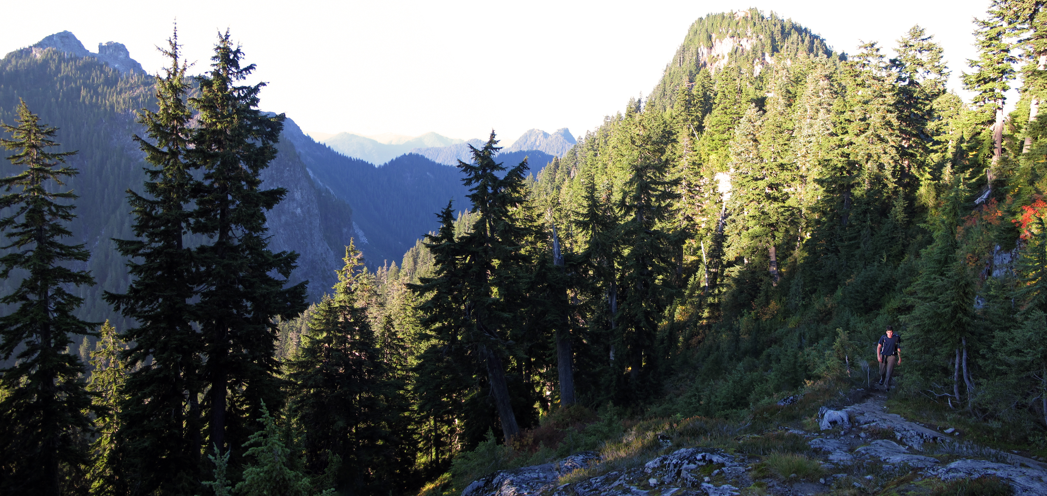 Upon seeing the crowds at the base of the grind and the BCMC trail and figuring that we had no reason to rush, we started up the grind and headed for one of the trails that leads directly up to Dam mountain in order to avoid the crowds. We reached the peak of Dam around 11:15 and took a break to eat lunch. Soon after beginning the descent from Dam to Crown pass, we encountered a group of German hikers who thought that there were bears on the ridge to Goat, and we were advised to not proceed. Not seeing any signs of bears, we ignored their advice and proceeded down to Crown pass and into Hanes valley. As we began the descent, the clouds finally cleared and gave way to sun, leaving us with perfect scrambling conditions.