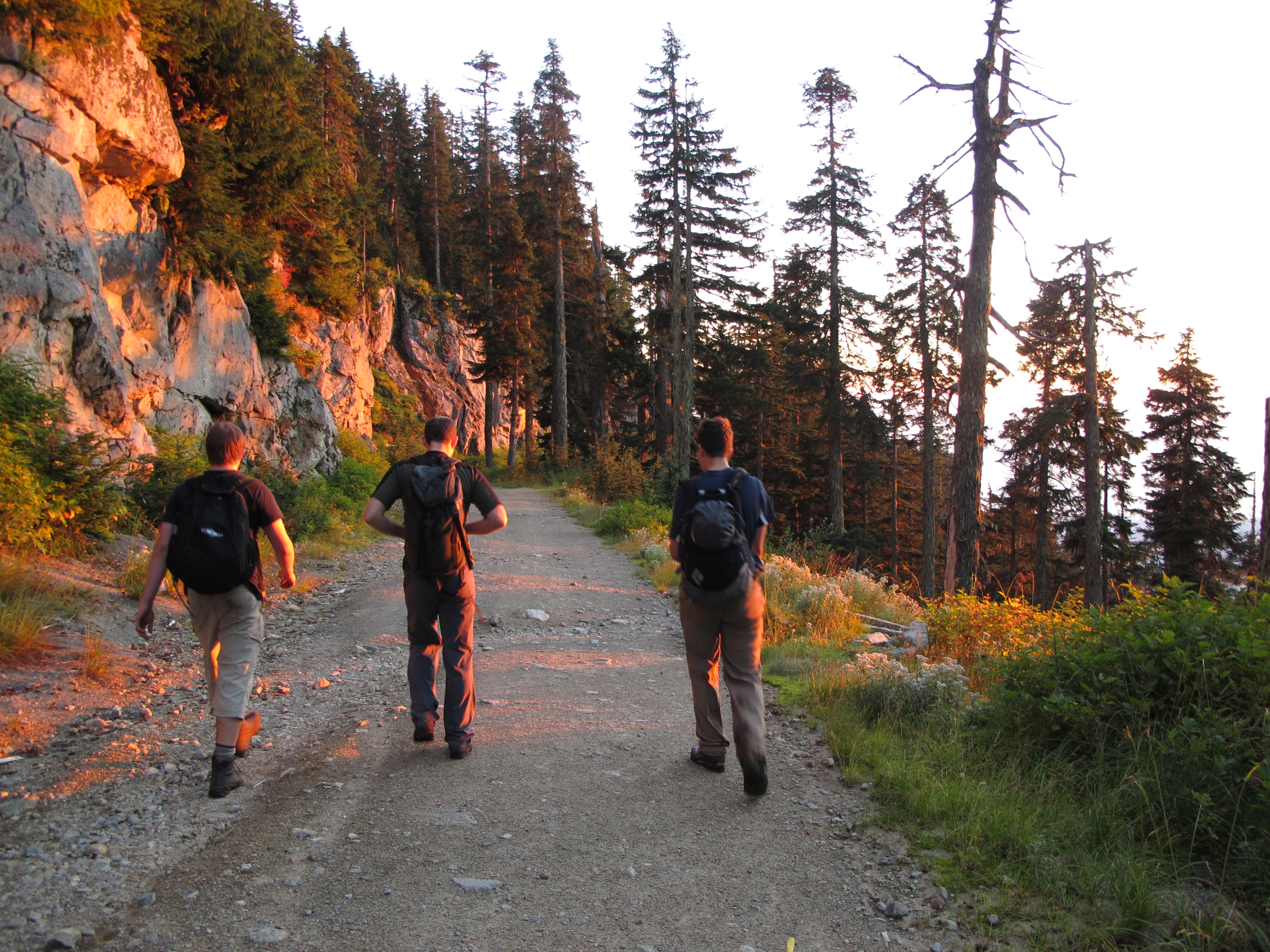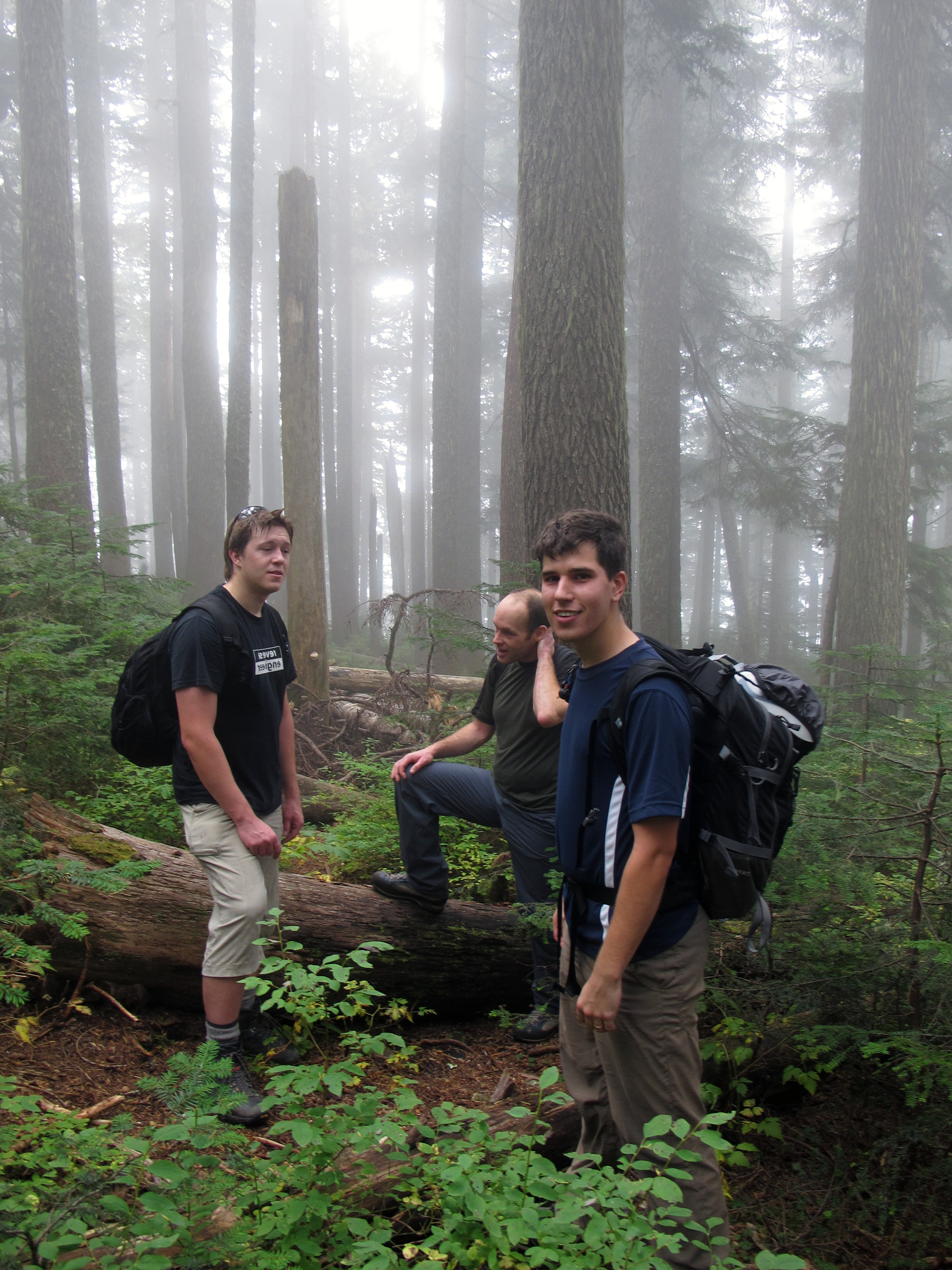 I awoke Saturday morning to a grey sky of low overcast and a call from David to inform me that my ride to the base of Grouse would be late. David, Max, and I ended up not arriving at the base of the grind until nearly 8:30, by which point Jeff had been waiting for us for a full half hour. We were unsure of whether it would be better to approach the crater slabs from Lynn / Hanes valley or from Grouse, but we decided on the Grouse approach after a friend told us that a couple weeks earlier he had some difficulties crossing Lynn creek. Another concern was that although the day was forecast to be dry and it had been dry all week in the city, online satellite precipitation maps showed that it had been raining lightly during the night in the vicinity of Crown mountain. It would turn out that there is little foliage in the couloir or on the slabs, and so although the forest was wet, by mid-day the rock was bone dry.