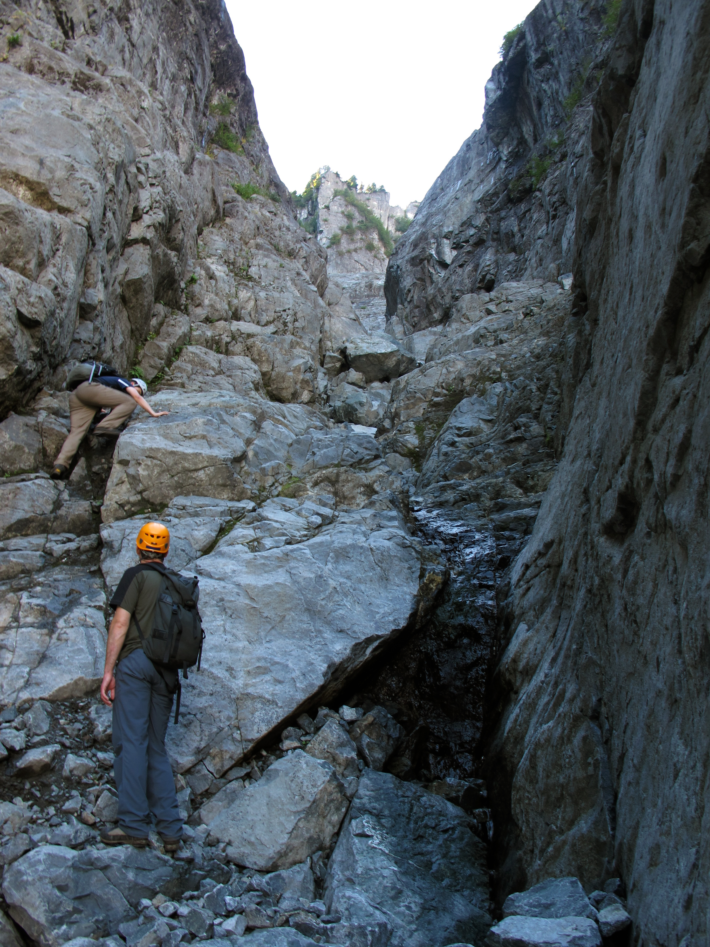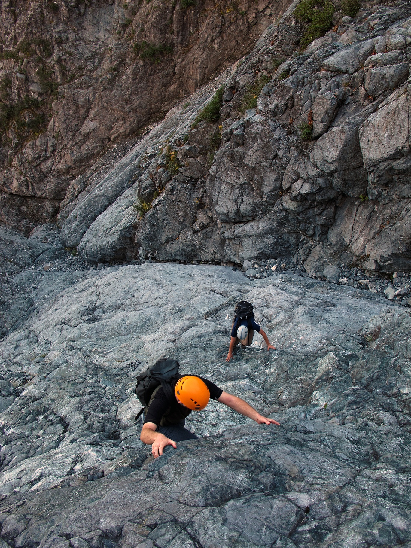 To reach the Crater Slabs, you ascend the slope from Hanes valley leading towards the summit of Crown, always following the left-hand wall. After 20 or so minutes of ascending from the valley bottom, we reached the beginning of the Crater Slabs route proper, where the route starts up a narrow rock gully with a small creek running through it. Until this point, the route is a straightforward hike, but from this point onwards the route steepens significantly, and although the gully is mostly 3rd class, there are a number of class 4 sections that many people would be uncomfortable ascending without a belay (especially when wet). The rock is generally of good quality, although friable in places. The most difficult step of the gulley is right at its end, where there is a short near-vertical wall that needs to be ascended to reach the main slabs. Once the slabs are reached, downclimbing the route to retreat would be significantly more difficult than continuing upwards.