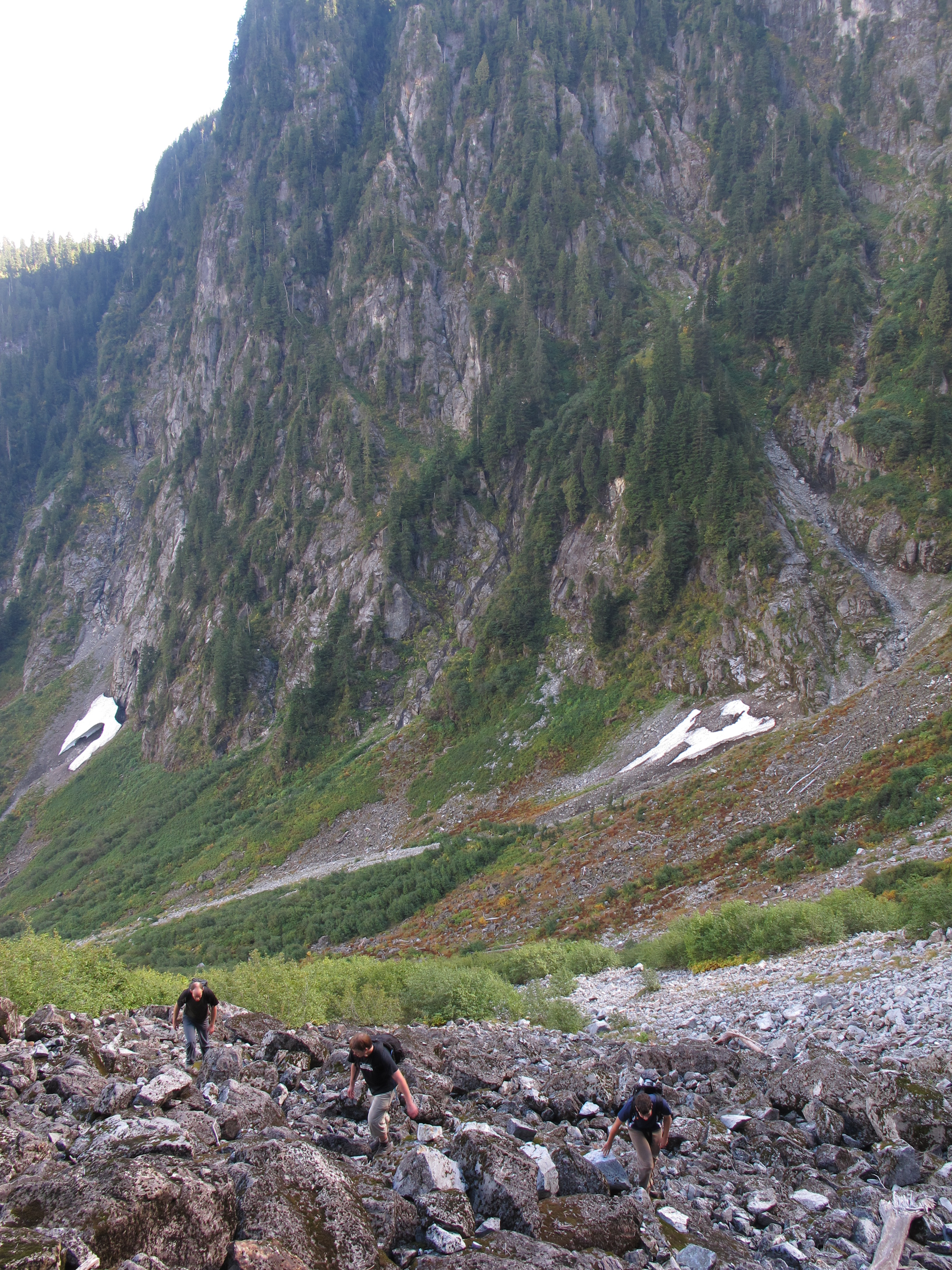 While descending into Hanes valley it looked like it might be possible to avoid descending all the way down until the talus slope that descends from Crown pass intersects the one coming down the valley from the summit of Crown by traversing the slopes at the base of the rock wall on the left. Not sure of whether the traverse was feasible or not, Jeff, Max, and I sat down as David went on a scouting mission to investigate. Some ten minutes later we could hear the words “go down” echo through the valley and we got up to head down to where the two talus slopes intersected. Not knowing what happened to David and apparently no longer in vocal communication range with him, we waited at the bottom for him, and were finally ready to begin our ascent of Crown from deep in Hanes valley at about 1:30.